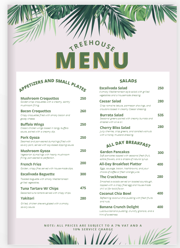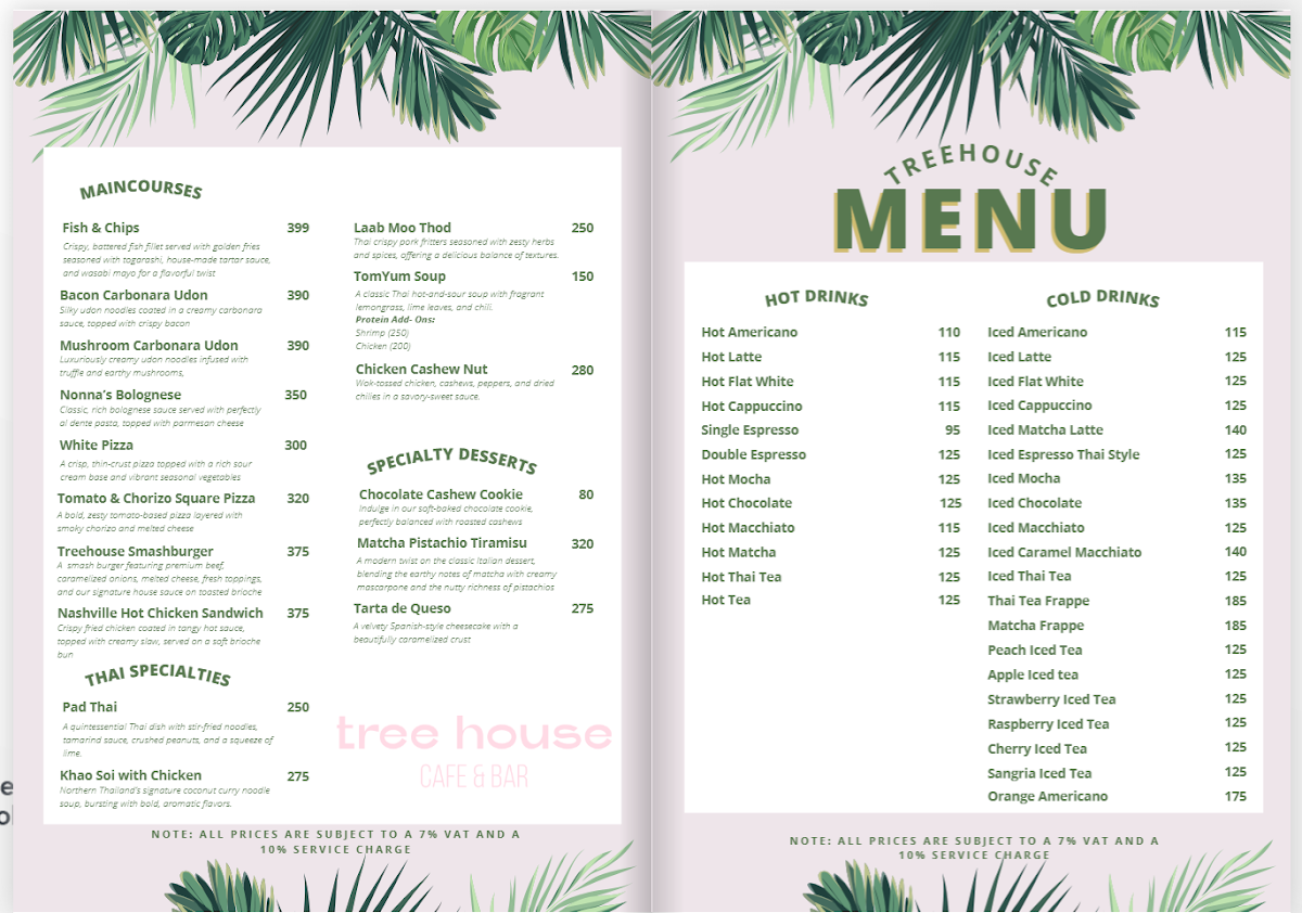 The menu at Treehouse Cafe & Bar is a thoughtfully curated blend of casual bites and comforting drinks, perfect for a relaxed meal or a leisurely break. It offers a simple yet satisfying selection, emphasizing fresh, familiar flavors suited to the easygoing atmosphere of this intimate urban hideaway.